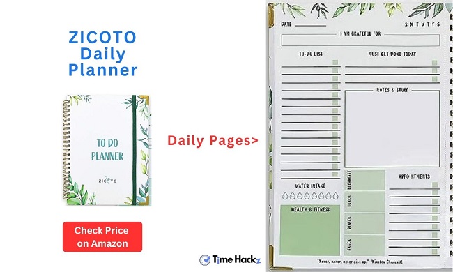 A compact 120-day planner that makes day-to-day task management more manageable. It covers everything in our everyday life – note-taking, to-do lists, prioritization, meal planning, fitness tracking, etc. In addition, inspirational quotes and gratitude practice will motivate you to achieve great things. Although the ZICOTO Daily planner is designed for women, anyone can use it to stay organized and focused.